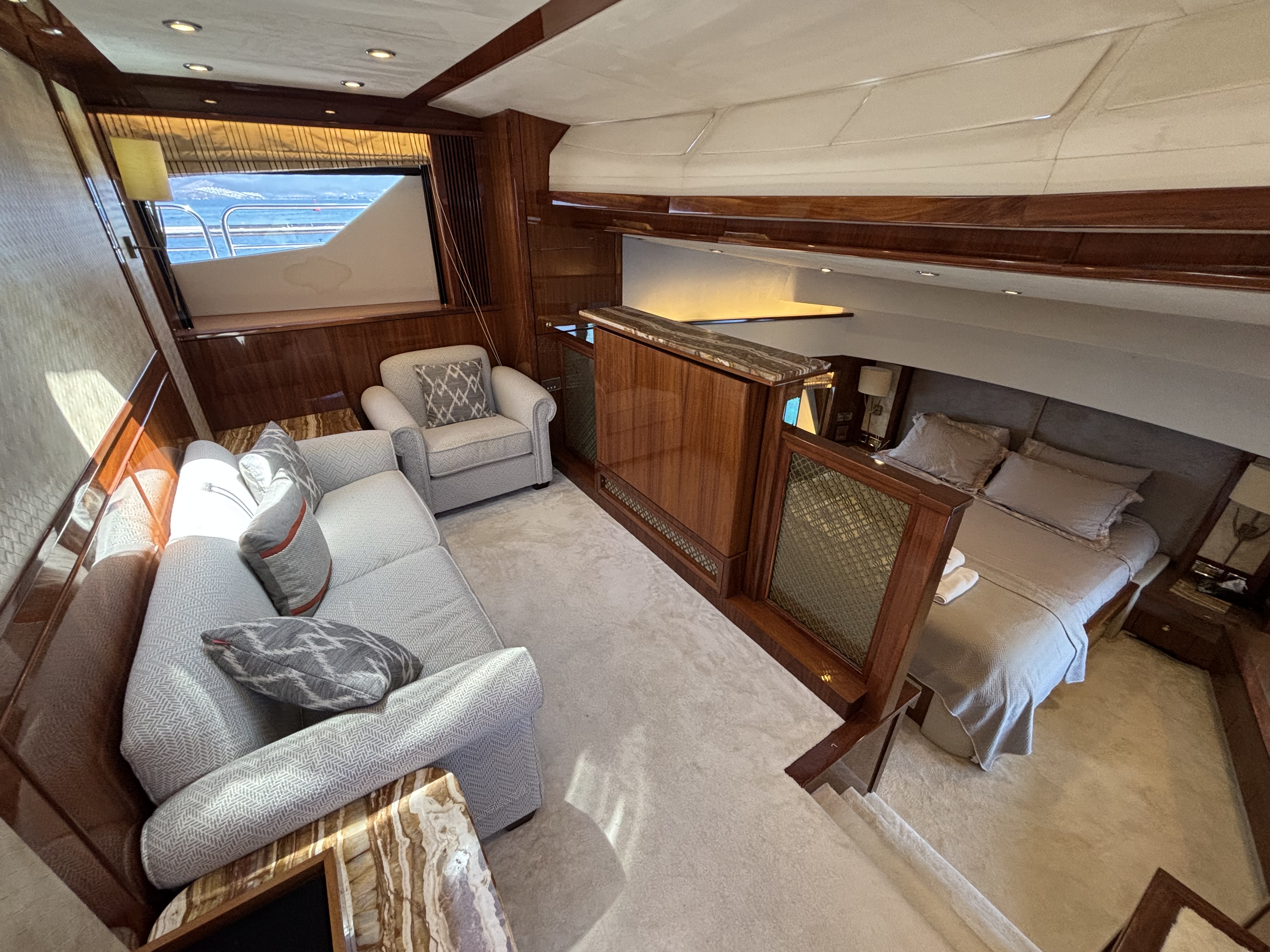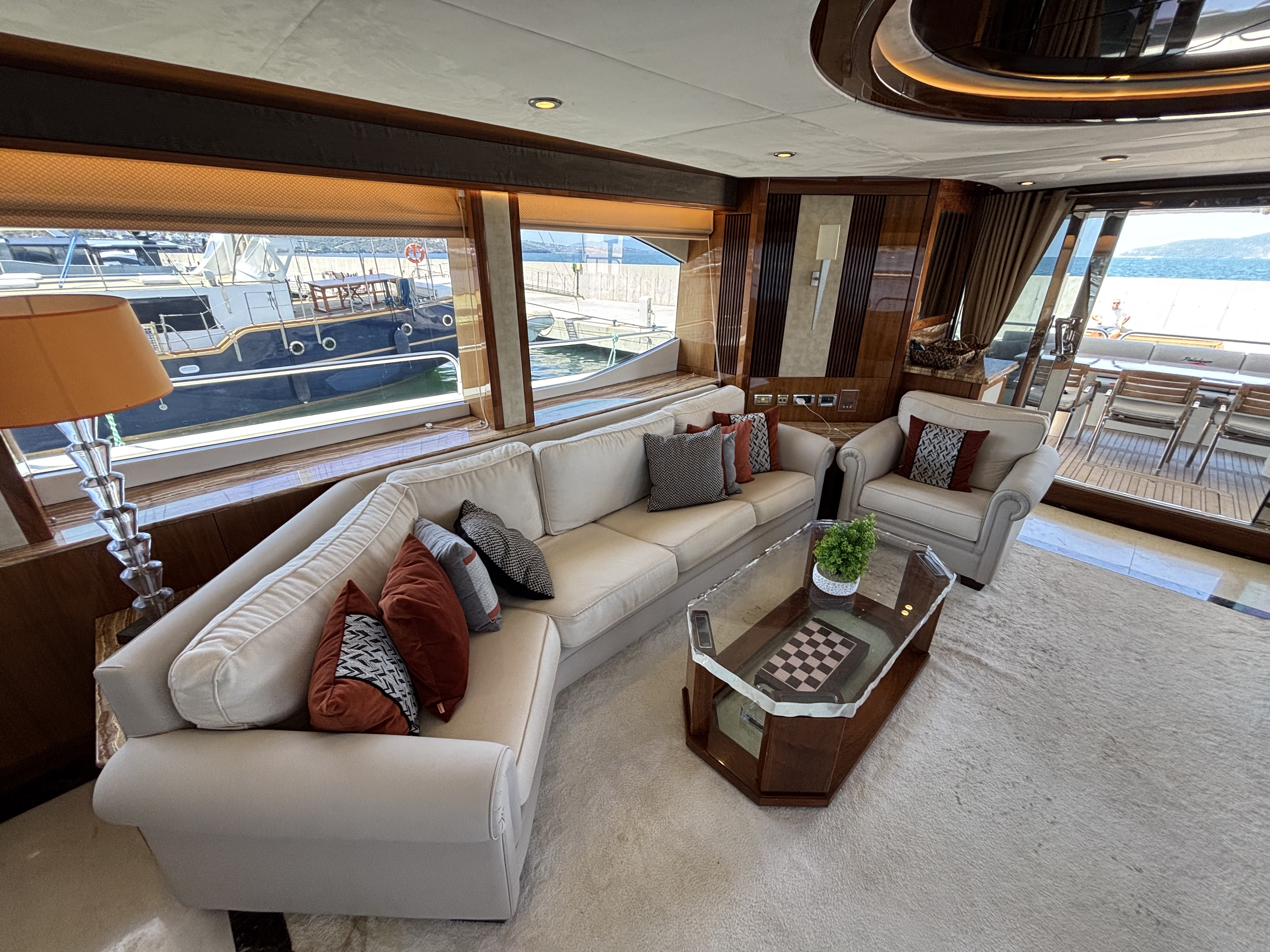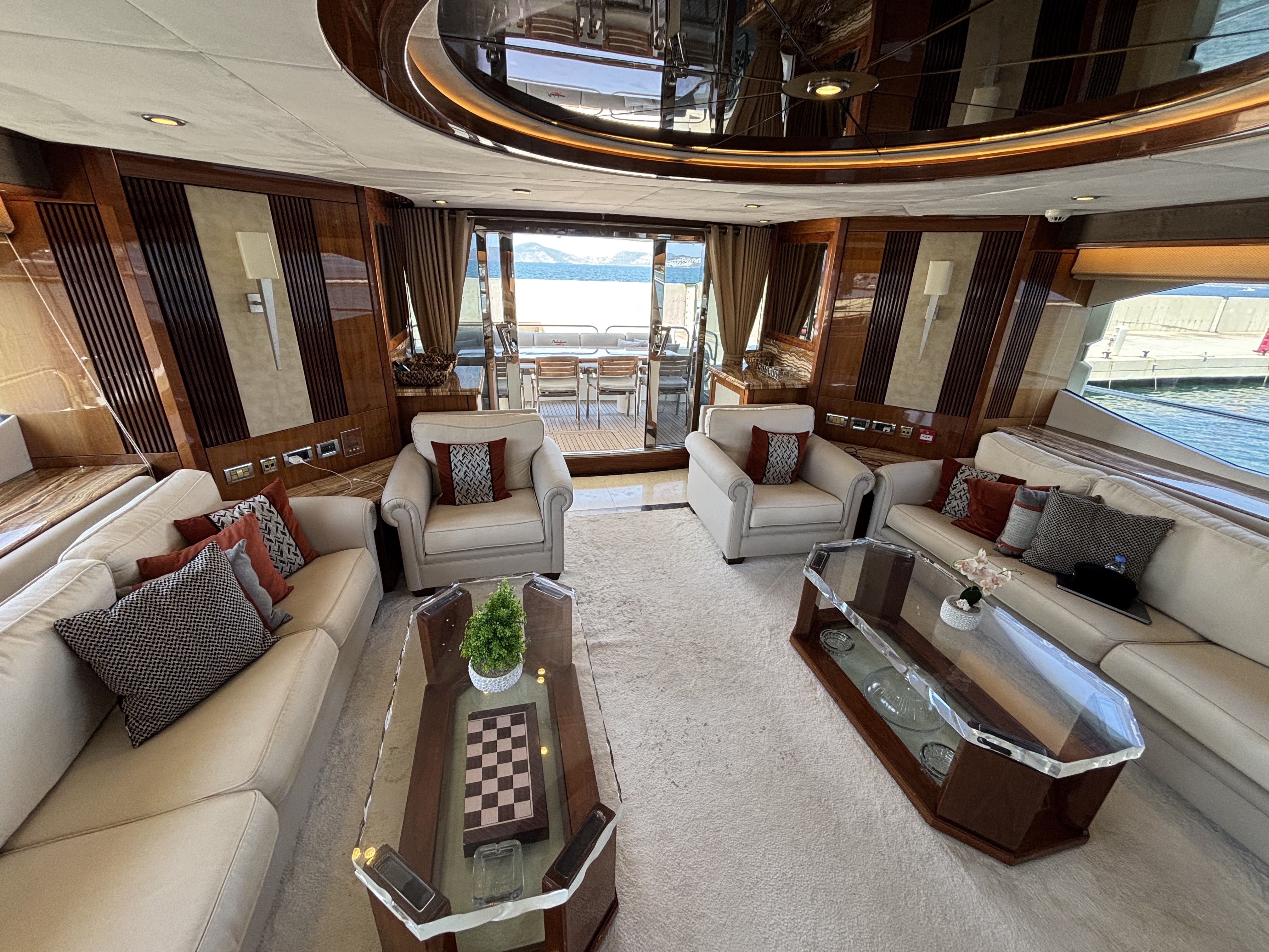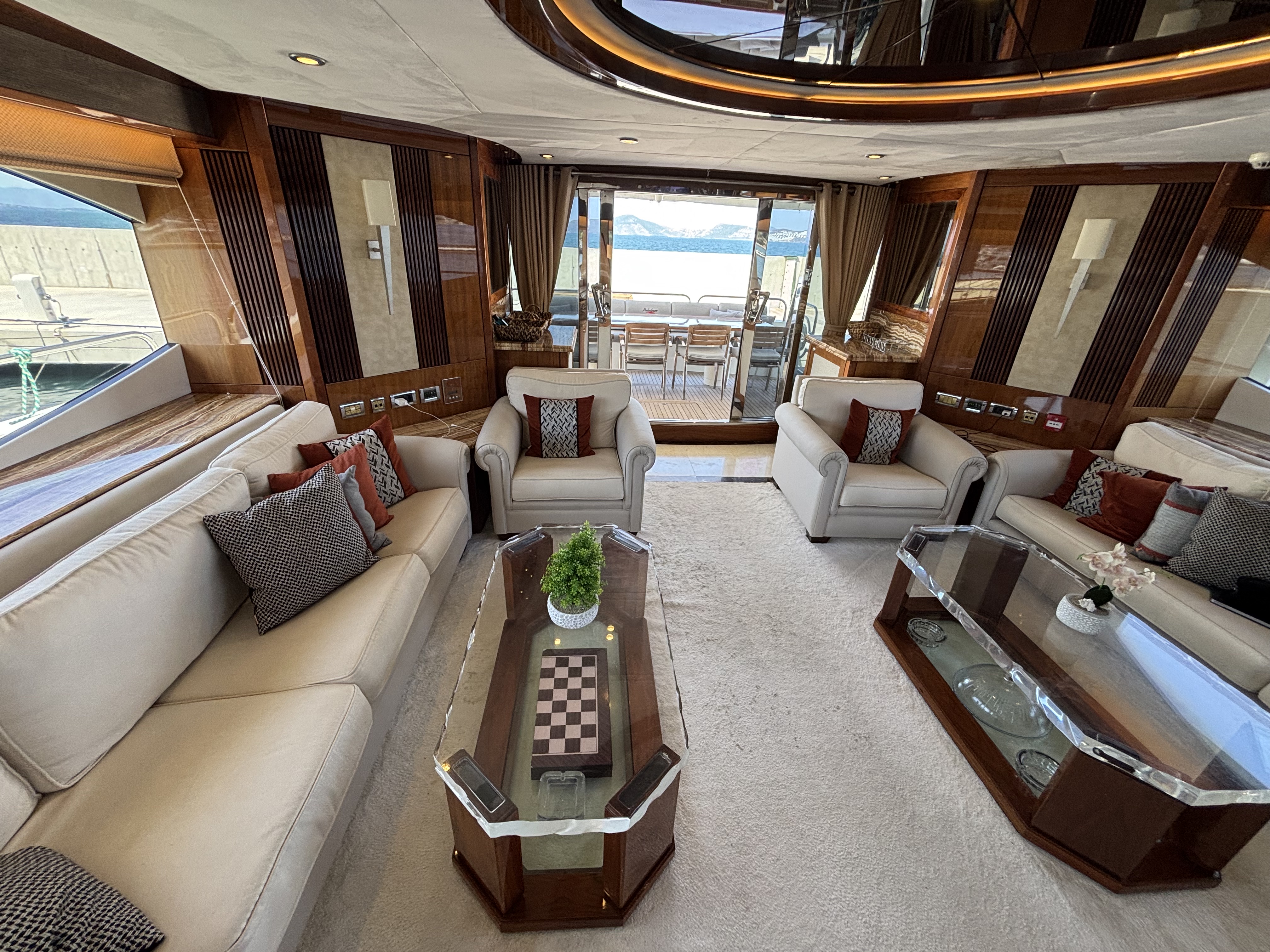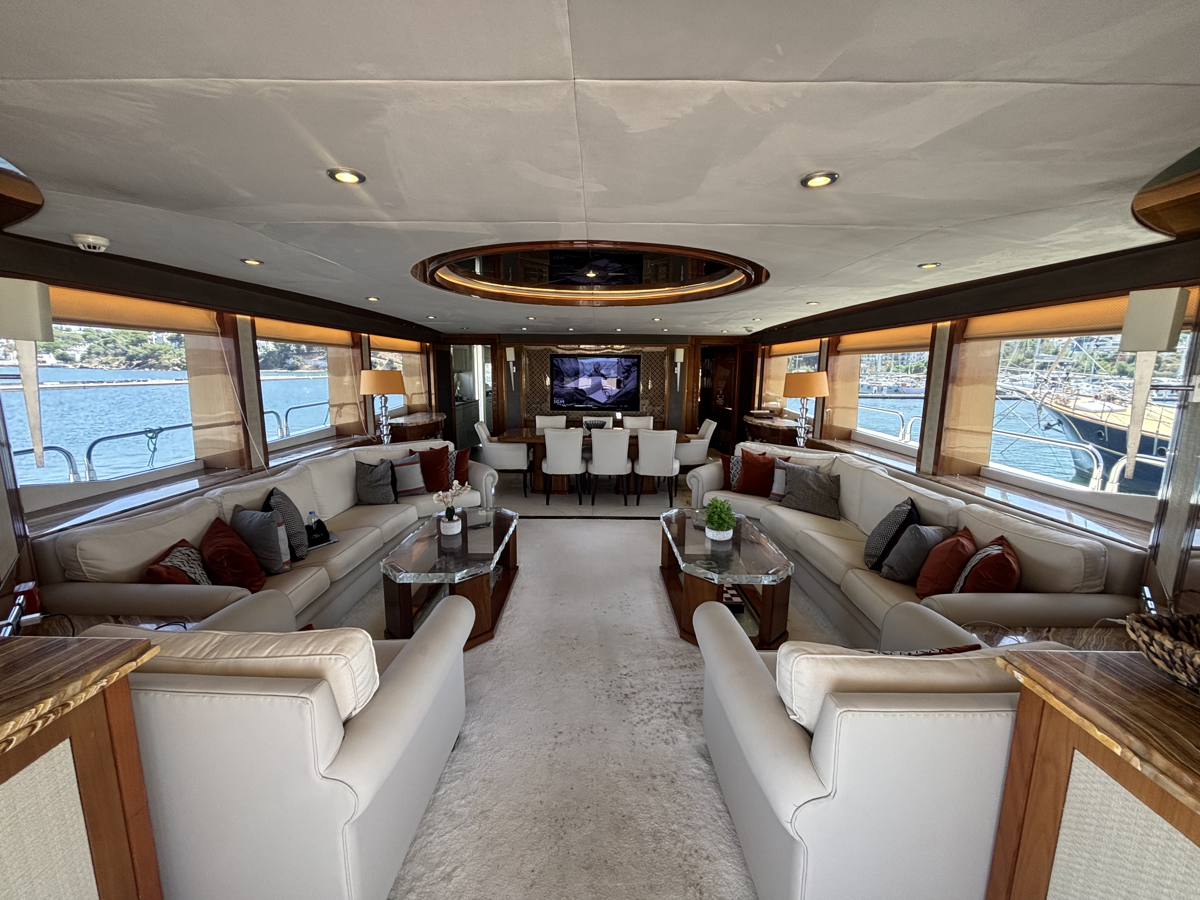 Desde el primer paso a bordo, te recibe un ambiente de lujo refinado. El salón principal desprende una sofisticación atemporal, con un espacio amplio ideal tanto para recibir invitados como para relajarse con total comodidad. Acabados en madera noble, mobiliario a medida y una atención al detalle impecable crean una atmósfera acogedora e impactante a la vez.
