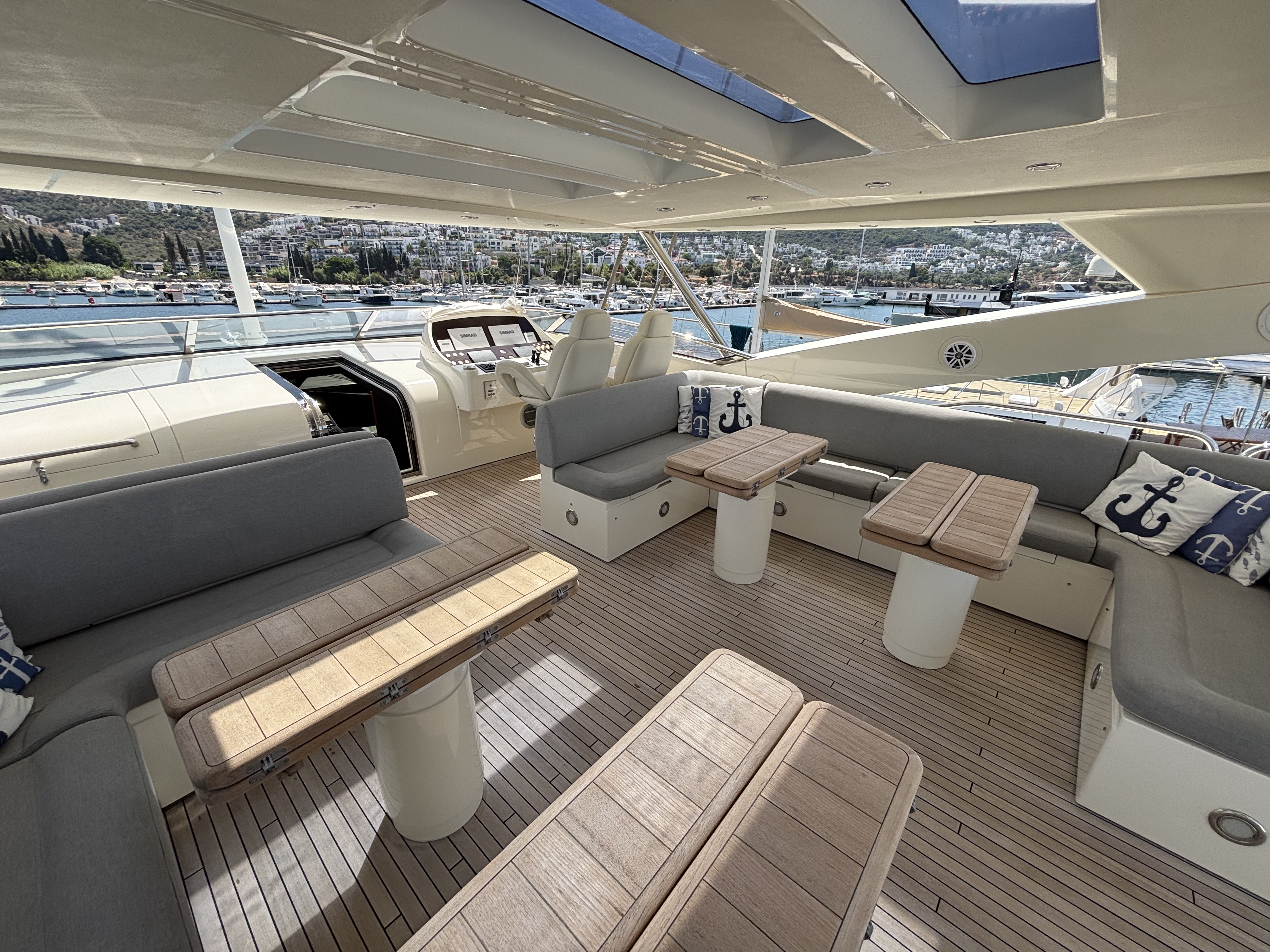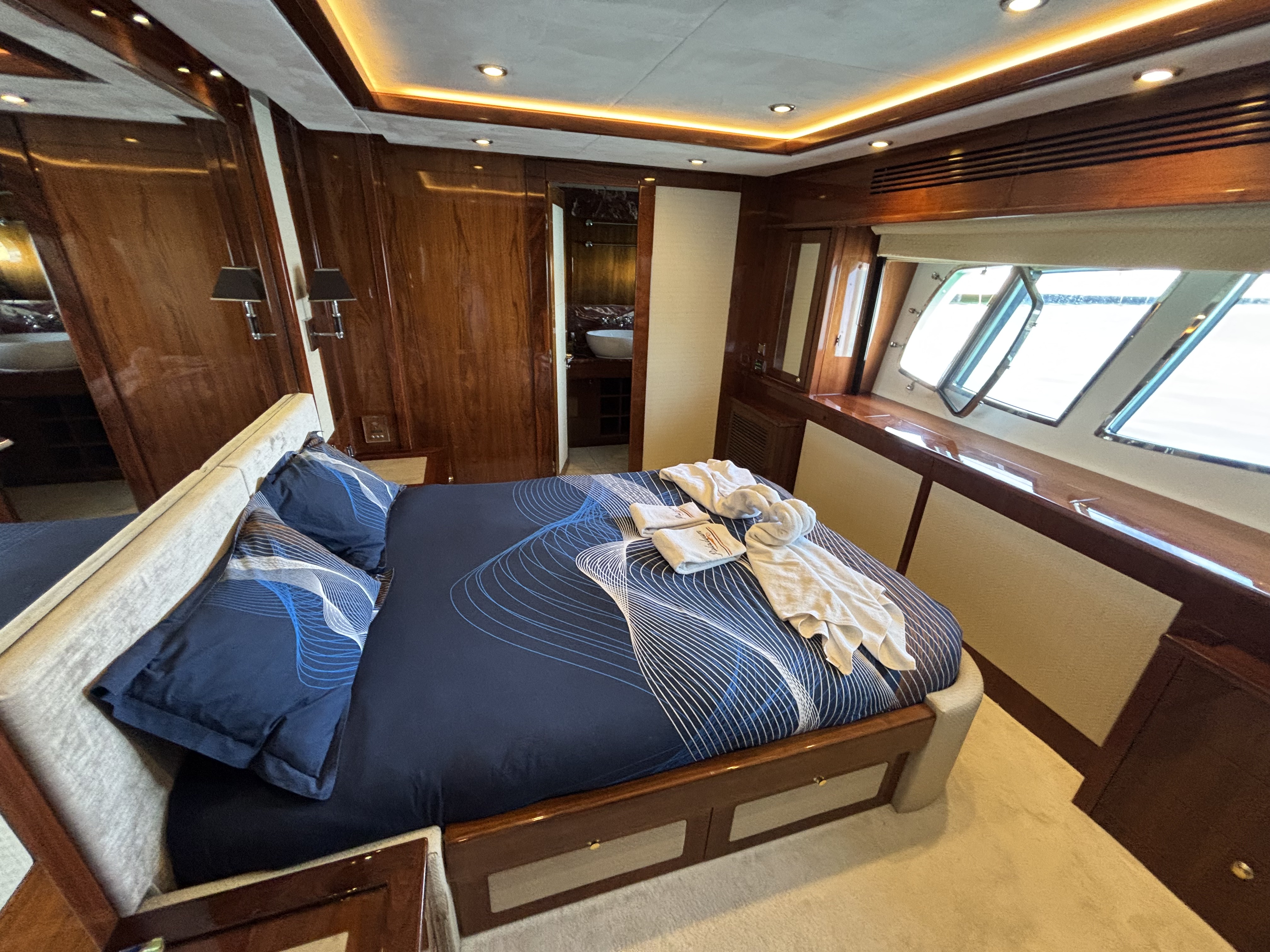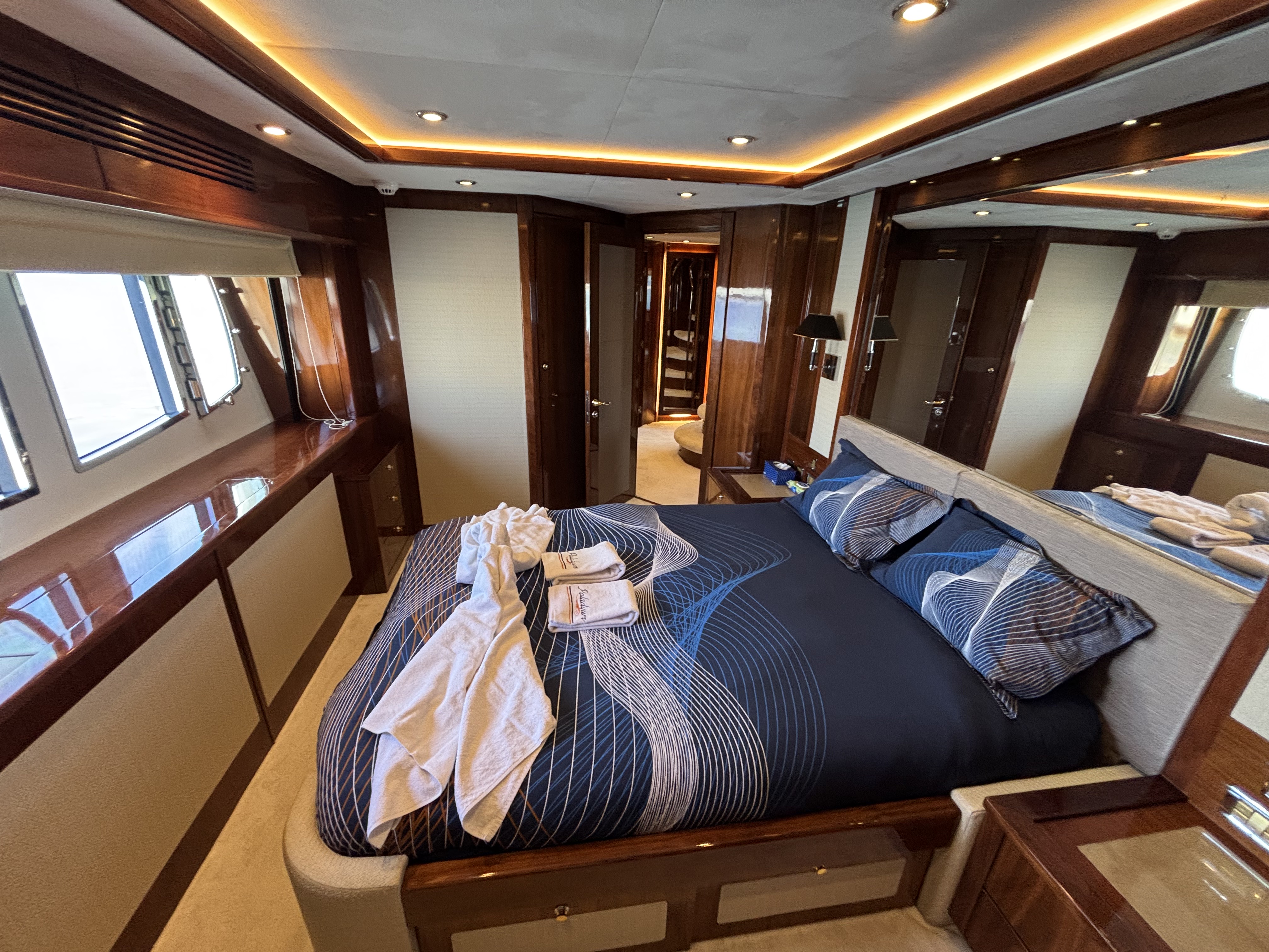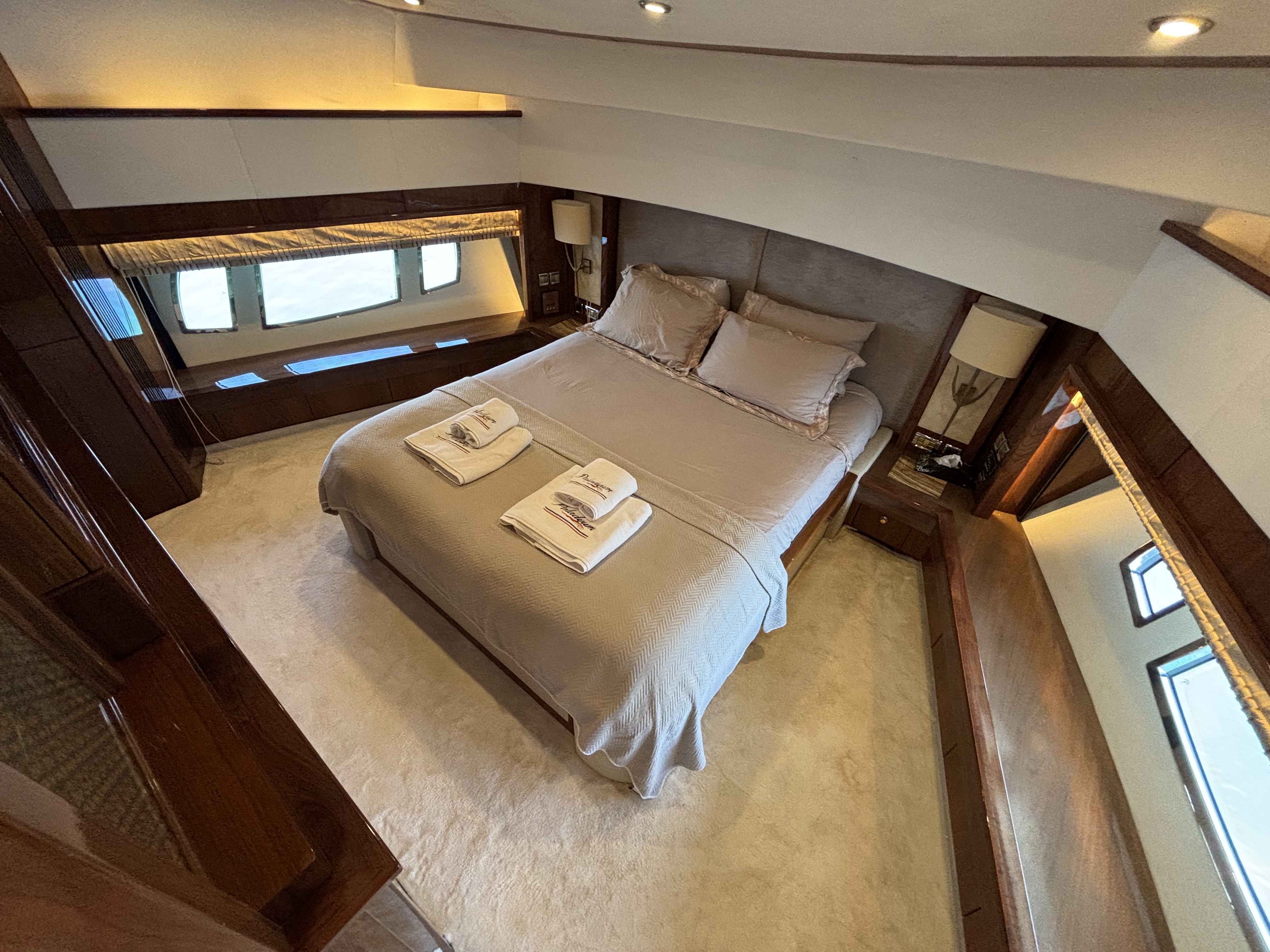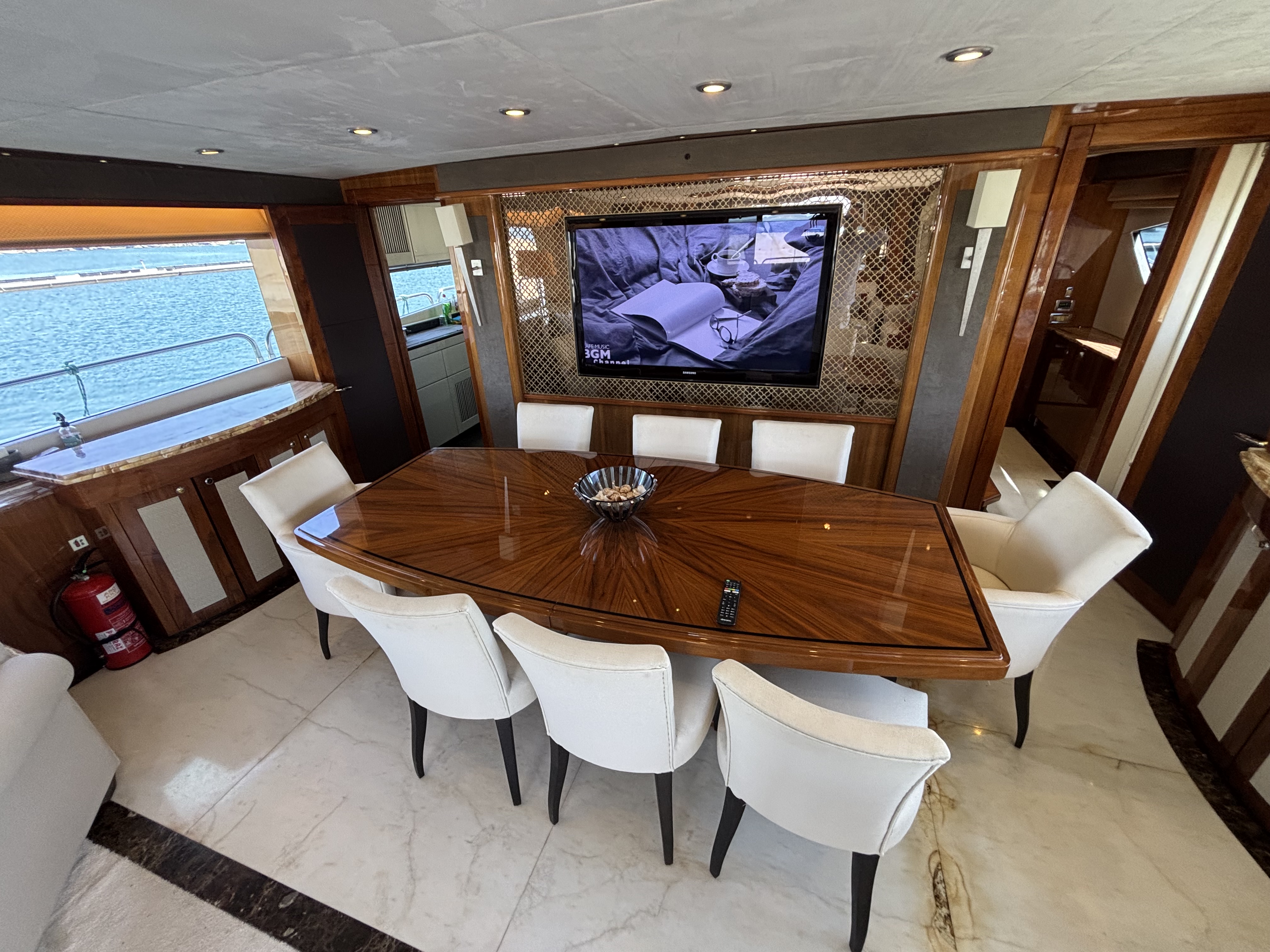 Desde el primer paso a bordo, te recibe un ambiente de lujo refinado. El salón principal desprende una sofisticación atemporal, con un espacio amplio ideal tanto para recibir invitados como para relajarse con total comodidad. Acabados en madera noble, mobiliario a medida y una atención al detalle impecable crean una atmósfera acogedora e impactante a la vez.