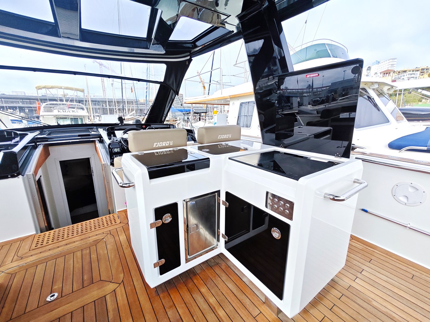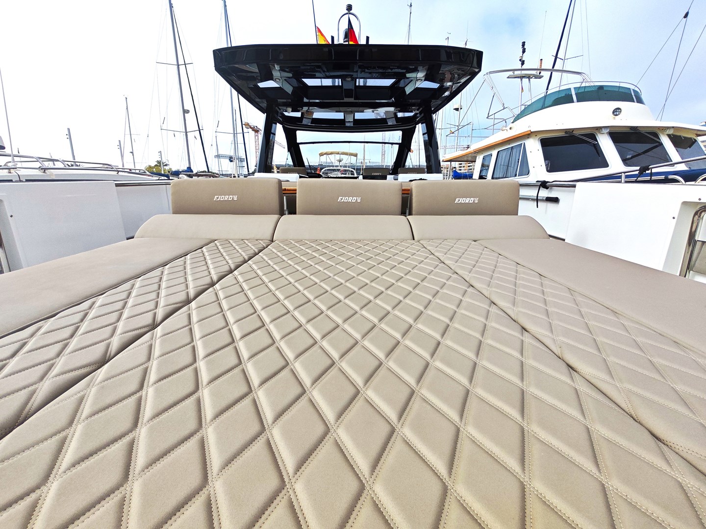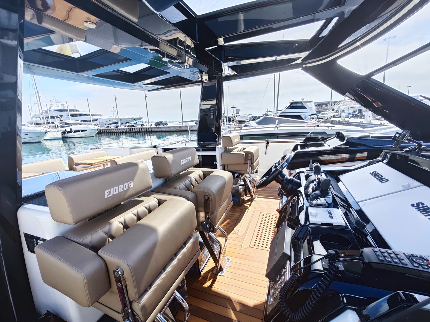 The Fjord 52 Open is the flagship of the open series. Powered by 1,300 horsepower and designed with the secure walk-around deck Fjord is known for, it delivers performance and confidence at every turn. The updated interior offers exceptional space and comfort, featuring modern wood finishes, mirrored storage, and refined wall materials. The owner’s bathroom continues this standard, with high-quality fittings and a thoughtful blend of textures that create a clean, contemporary atmosphere.