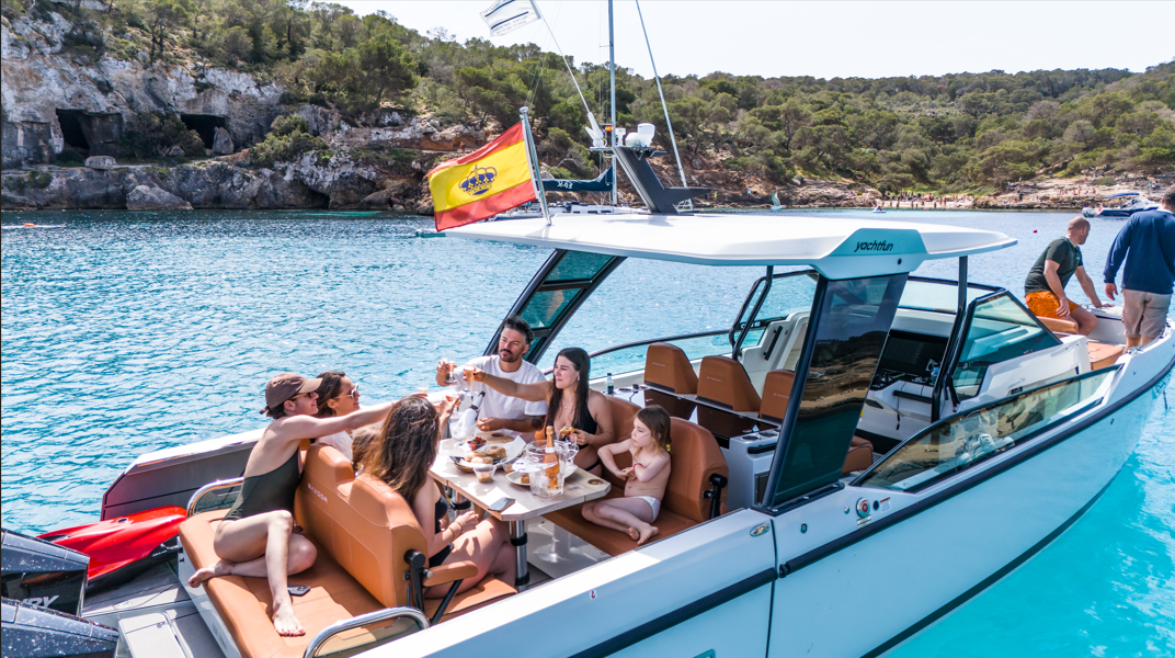 Esta hermosa embarcación combina diseño italiano, funcionalidad americana, calidad alemana, un diseño exquisito y un potente rendimiento fuera de borda, convirtiéndola en el barco perfecto para charter de día.