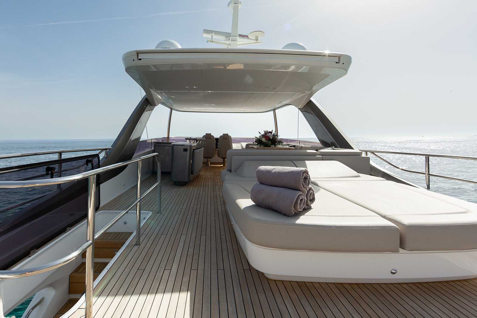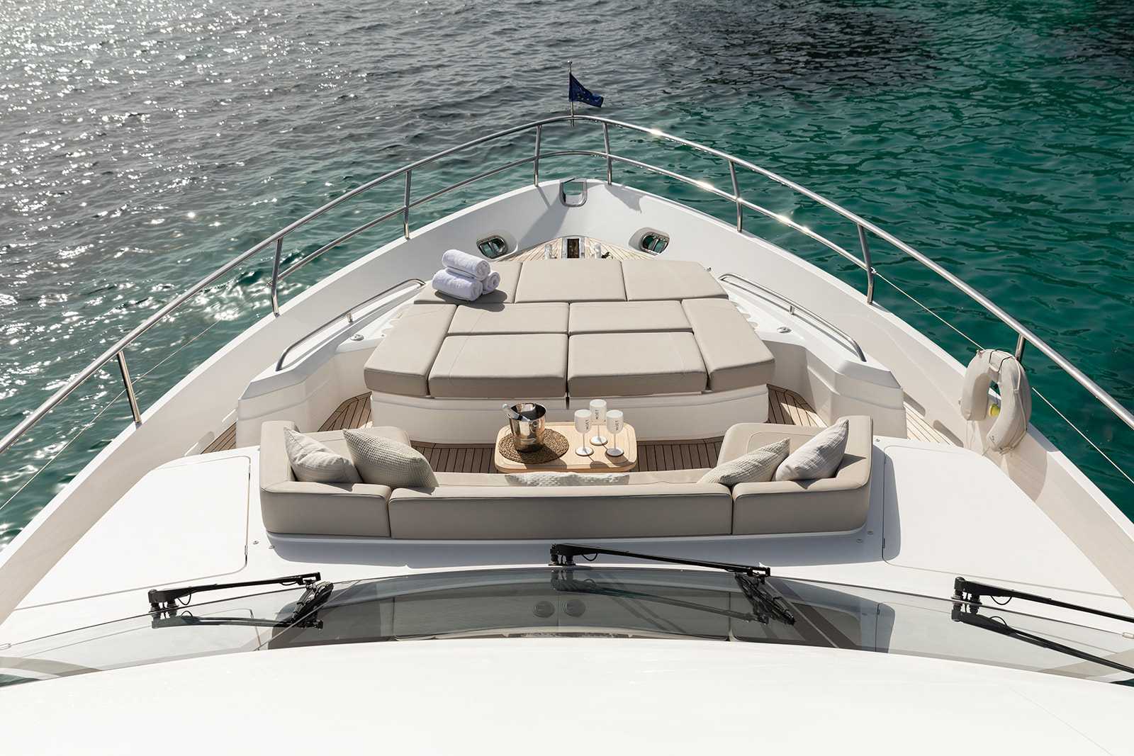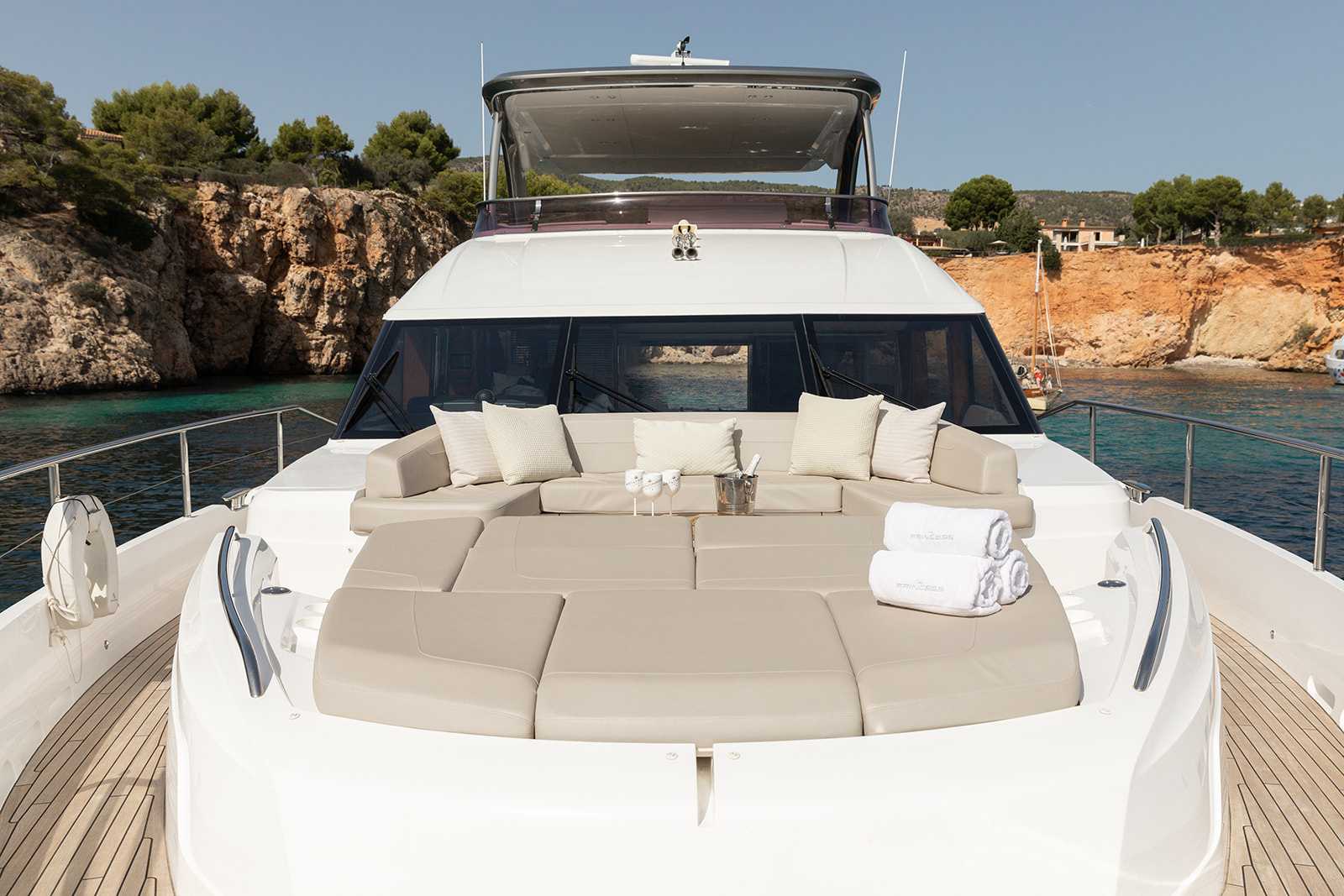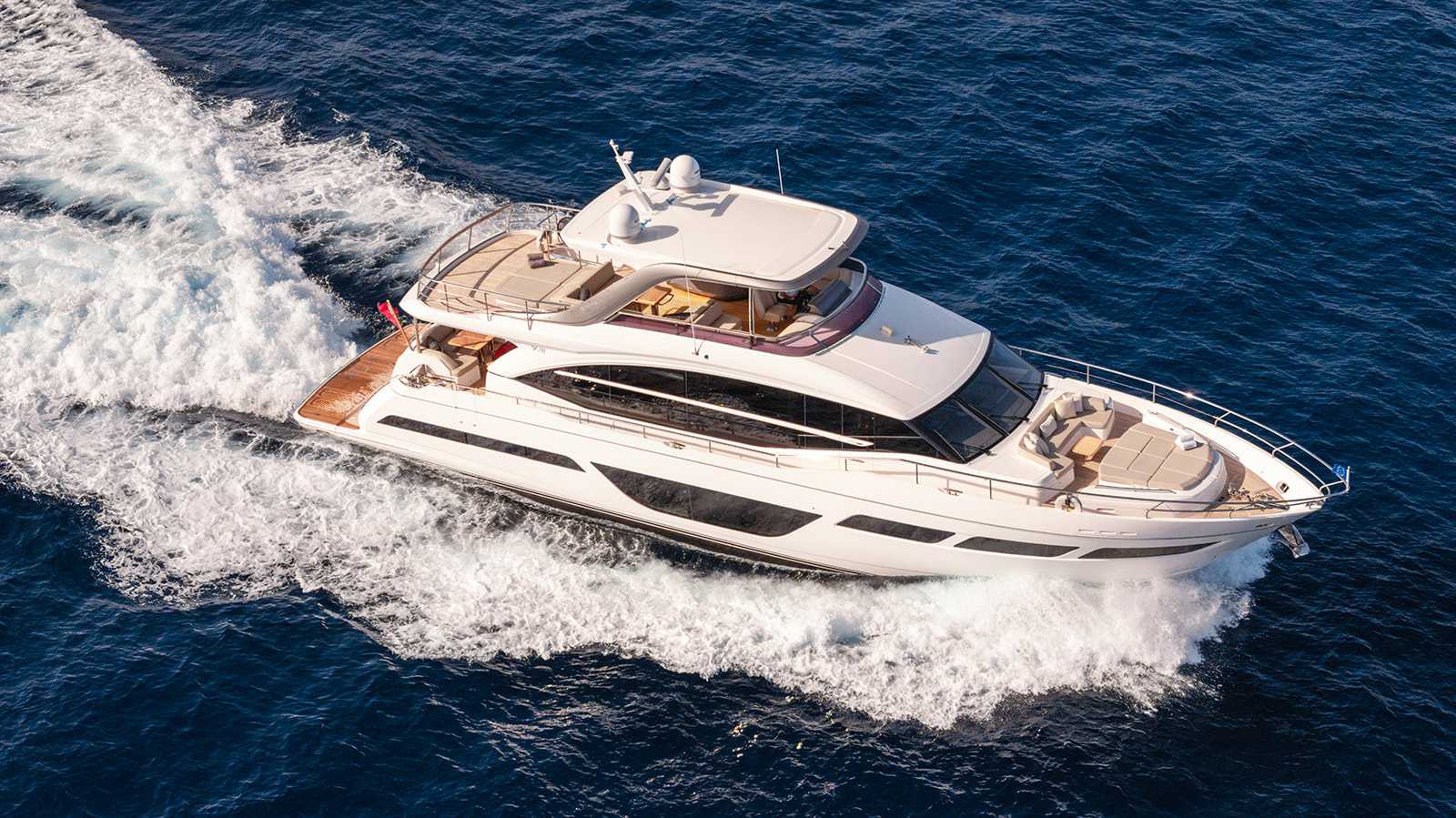 The Princess Y78 offers a refined blend of luxury, style and performance on the water. Its sleek lines, spacious flybridge and generous decks — including foredeck sun-pads and an aft cockpit — provide ample space for relaxation, socialising or sunbathing. Inside, the bright salon with large windows flows into a modern dining and galley area, while below deck four ensuite cabins accommodate up to eight guests in comfort