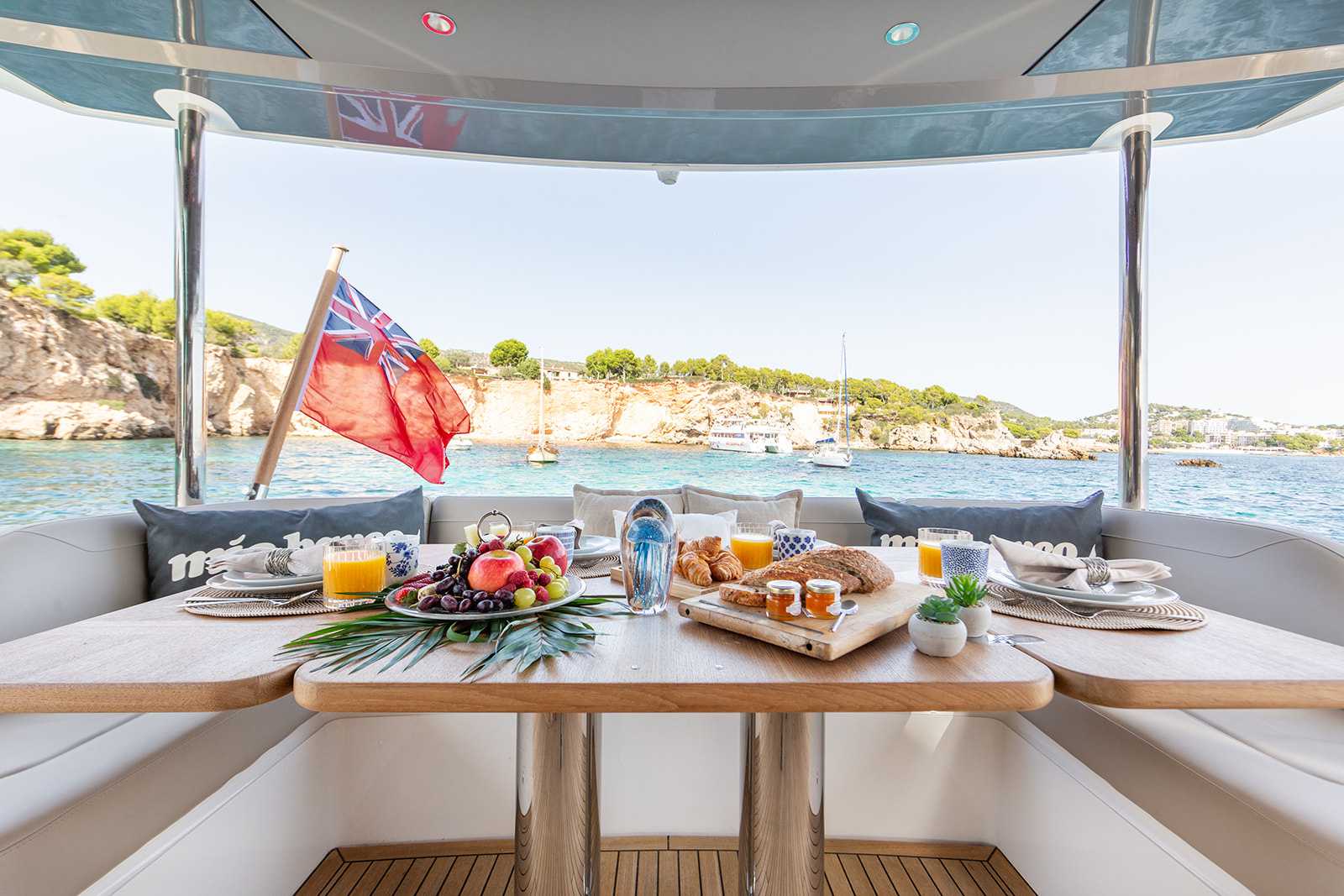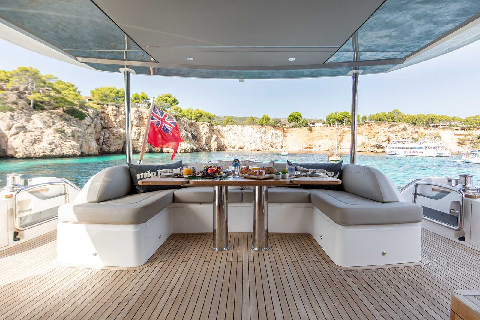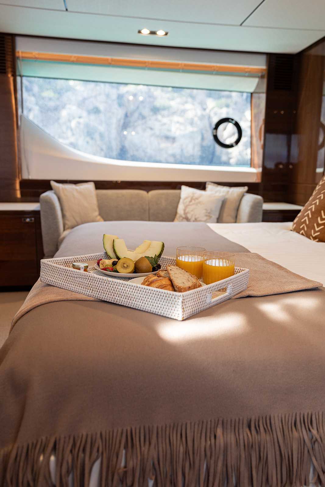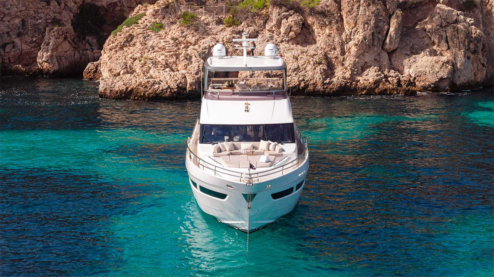 The Princess Y78 offers a refined blend of luxury, style and performance on the water. Its sleek lines, spacious flybridge and generous decks — including foredeck sun-pads and an aft cockpit — provide ample space for relaxation, socialising or sunbathing. Inside, the bright salon with large windows flows into a modern dining and galley area, while below deck four ensuite cabins accommodate up to eight guests in comfort